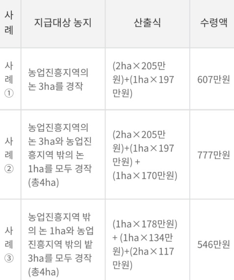 - 금액: 경작 면적, 작물 종류 등에 따라 차등 지급