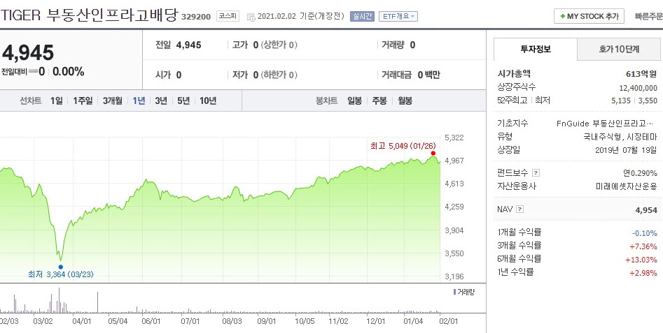 TIGER 부동산인프라고배당은 국내 메이저 운용사인 미래에셋자산운용에서 운용하고 있으며, 2021년 1월 기준으로 시가총액은 613억 원입니다. 아쉽게도 운용보수(수수료)를 연 0.29%로 다소 높은 편입니다.