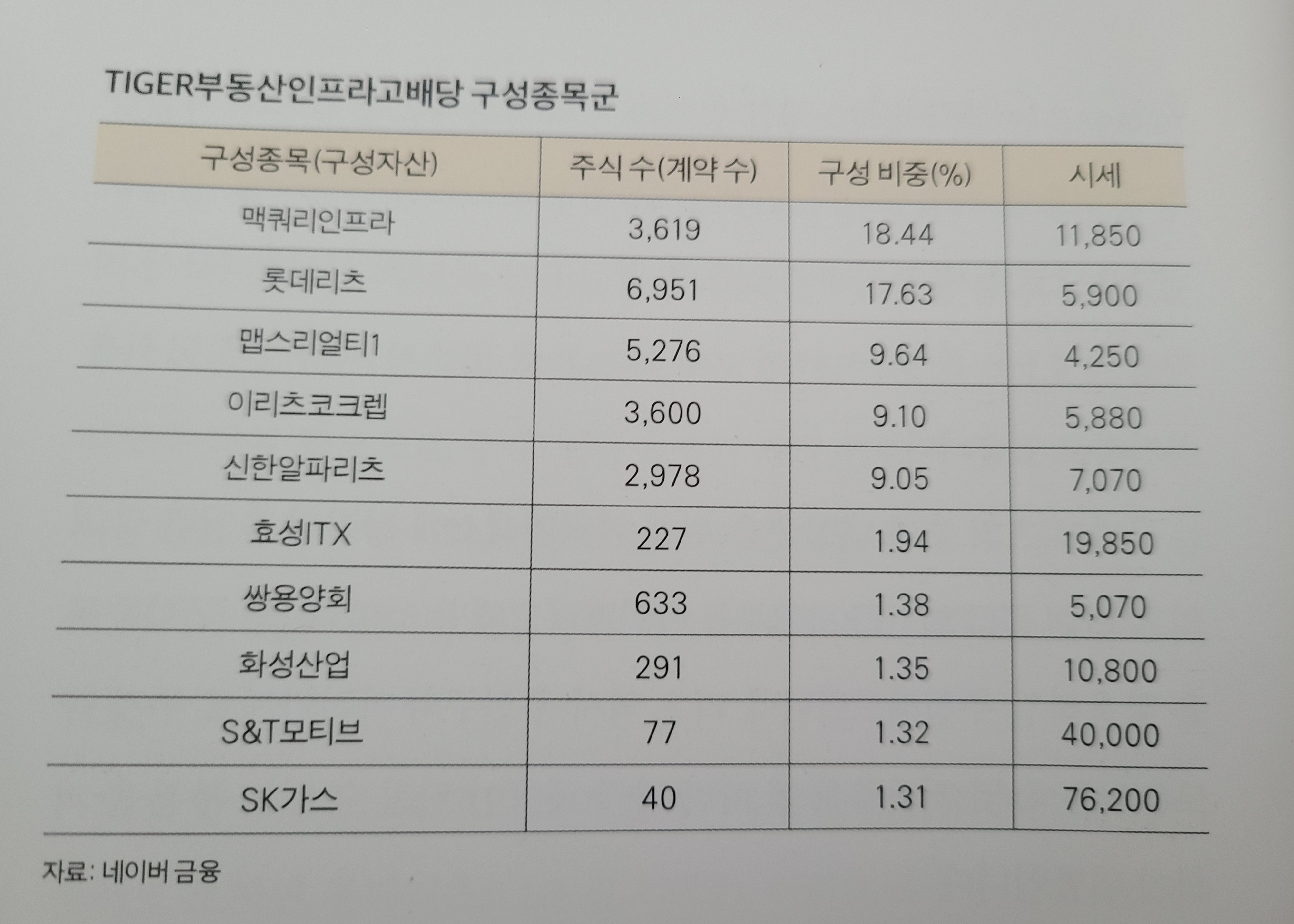 TIGER 부동산인프라고배당 구성종목군입니다.
