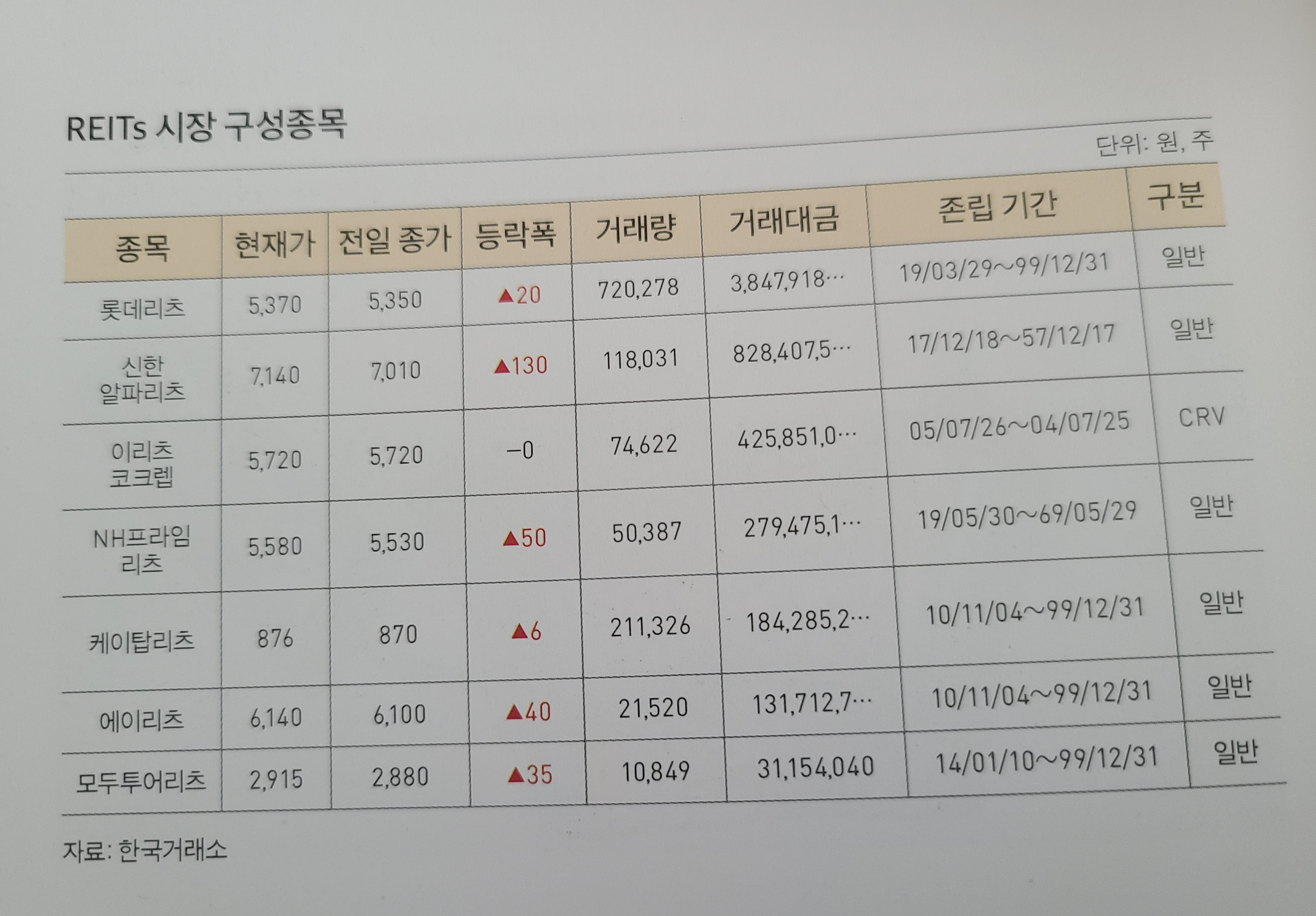 현재 한국거래소에는 7개의 리츠 종목이 상장되어 있습니다.