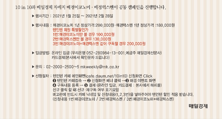 저의 경우도 12월에 구독 신청을 하려다 재테크 커뮤니티 10 in 10에서 매경 이코노미 구독 이벤트를 매년 한다고 해서 기다리고 있었답니다.