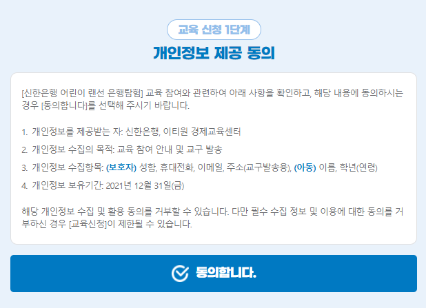 개인정보 제공 동의 부분을 꼼꼼하게 읽어 보시고 [동의합니다]에 체크해주세요.