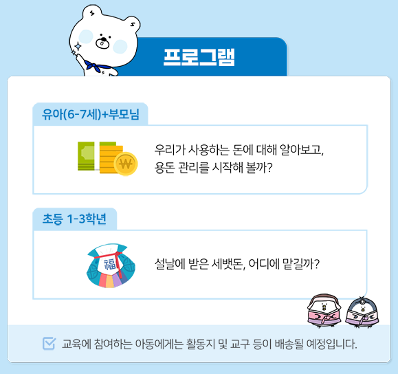 우리가 사용하는 돈에 대해서 같이 알아보고 용돈 관리를 시작할 수 있도록 도와줍니다.