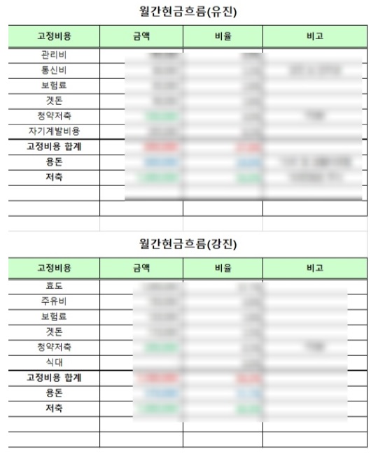 그리고 남편의 경우도 월간 현금흐름을 정리하여 세부 항목들을 관리하고 있어요.
