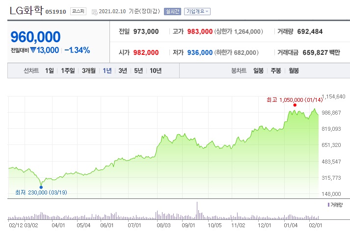 LG에너지솔루션은 LG화학에서 분사된 만큼 분사 당사에는 LG화학에 악재로 작용되며 주식이 60만 원대로 빠지기도 했었는데요. 요즘에는 LG화학의 주가가 고공행진을 하고 있습니다.