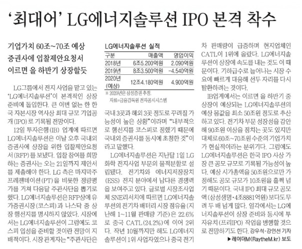 '최대어' LG에너지솔루션 IPO 본격 착수 되었다는 내용이 신문 지면을 장식하고 있습니다.